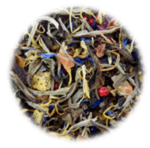 Witte thee Pai Mu Tan, papayastukjes, perenstukjes, peperkorrels, rozenblaadjes, perzikstukjes, blauwe korenbloem, goudsbloem, aroma
